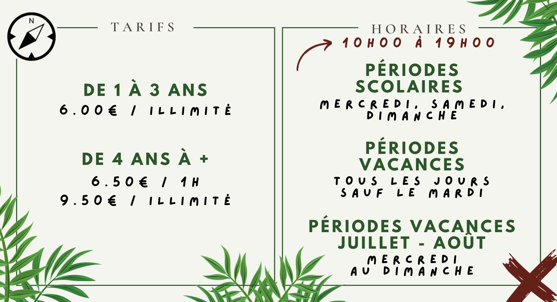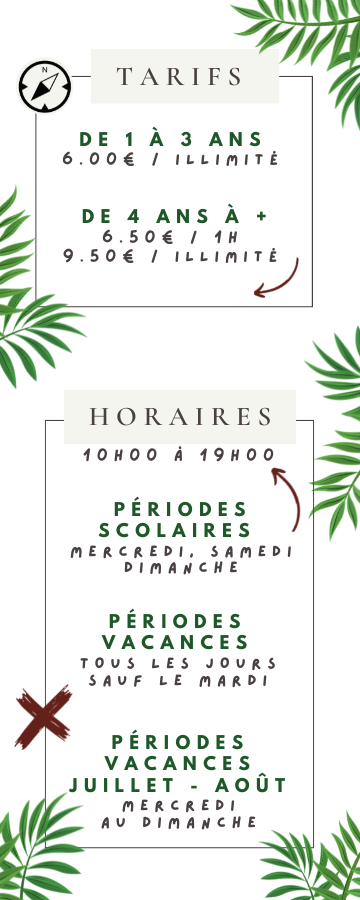 Dans notre vaste espace couvert de 600m², vos petits aventuriers découvriront une structure géante sur trois étages remplie d’obstacles, de toboggans, de piscines à balles colorées et de trampolines. Ils pourront glisser sur les rouleaux, voler sur la tyrolienne et bondir sur les châteaux gonflables.